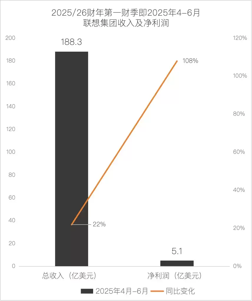 数据则提供了另一种视角:近五年来,联想集团的净利润(公司权益持有人应占溢利)保持在10-20亿美元区间。今年第二季度(2025/26财年第一财季,即2025年4月-6月),净利润更是达到5.1亿美元,同比翻了一倍还多;收入(188.3亿美元)也比去年同期涨了22%。