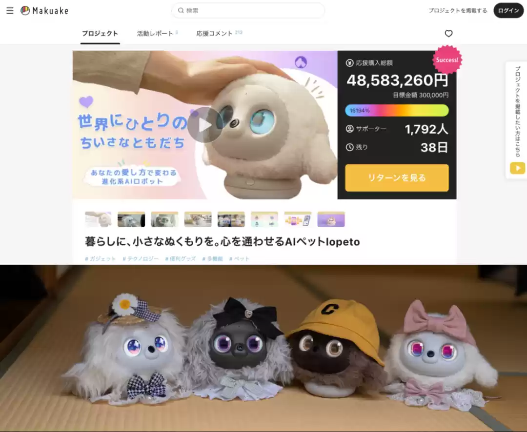 8月初,Ropet又一次在日本众筹 Makuake上爆单。众筹首日实现了2687万日元(约合130万人民币)的众筹金额,在该 的当日榜排名第一。现在已经完成近5千万日元的众筹规模。