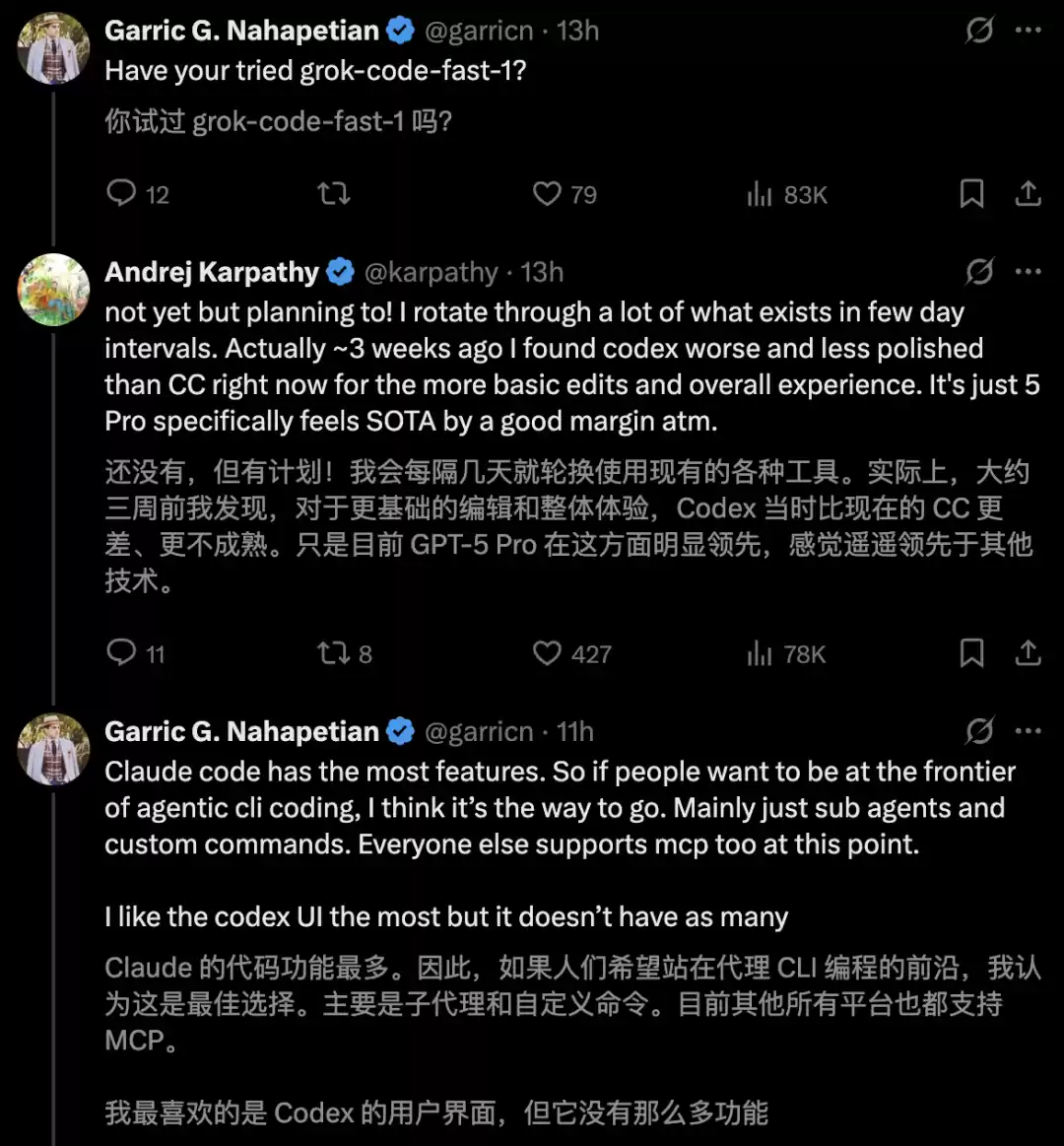 评论区,一位网友问Karpathy有没有尝试过grok-code-fast-1?