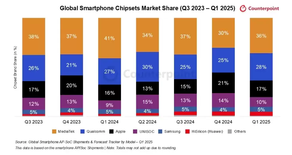 Counterpoint Research的数据显示,2025年第一季度全球智能手机应用处理器市场,海思的市场份额为4%,而上一年同期为2%,取得了显著进展。