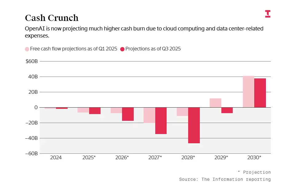 但最新的现金流预测显示,OpenAI今年将消耗超过80亿美元资金,比年初预期高出 15 亿;明年这一数字更将翻倍,突破170亿美元,比此前预测高出100亿美元。到2027和2028年,OpenAI的现金消耗可能飙升至350 亿和450亿美元。值得注意的是,OpenAI预计2028年消耗现金110亿美元,这意味着新的预测比之前高出四倍多。