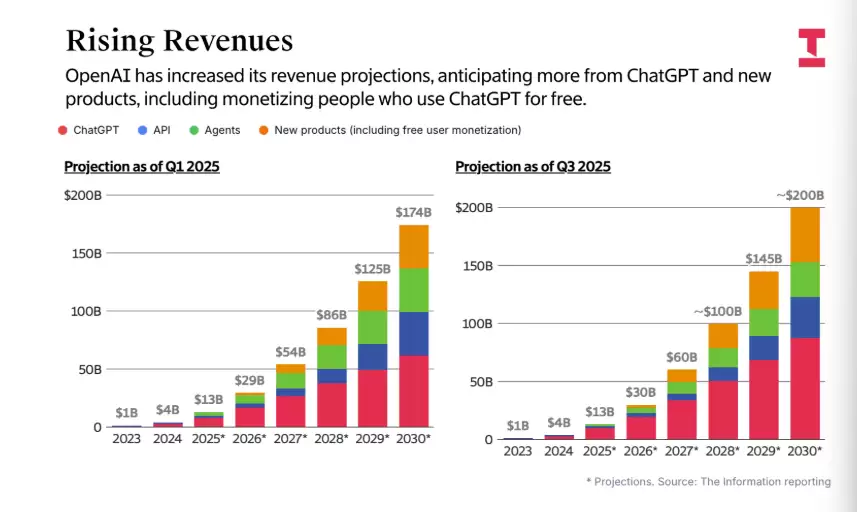 总体而言,OpenAI预计今年总收入将达到130亿美元,是去年的3.5倍,且比早期对2025年的预测高出3亿美元。2030年的总收入则有望达到2000亿美元,较先前预期提升15%。
