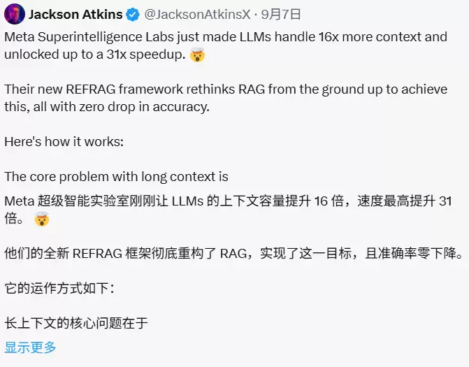 近期,Meta Superintelligence Labs 联合提出了一个名为 REFRAG 的高效解码框架,旨在解决 LLM 在处理长上下文输入时面临的效率瓶颈,尤其是在 RAG 等应用场景下。