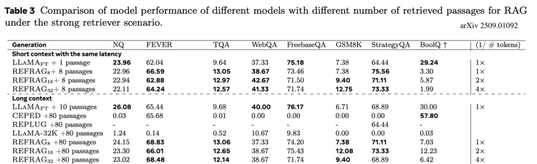 选择性压缩。为了进一步提升答案预测的准确性,该方法(REFRAG)引入了选择性词元压缩机制。其核心思想是,对于上下文中特别重要的信息块,可以不进行压缩,而是以原始形式保留,从而避免关键信息丢失。