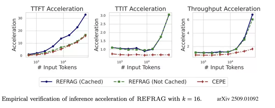 速度提升: 将首个 token 生成时间(TTFT)加速高达 30.8 倍。在 16k tokens 的场景下,相比 CEPE 等基线方法,实现了超过 16 倍的 TTFT 加速。从性能图表可以看出,文本越长,REFRAG 的优势越明显,其加速效果随上下文规模增加呈指数级提升,而基线方法仅为线性增长。