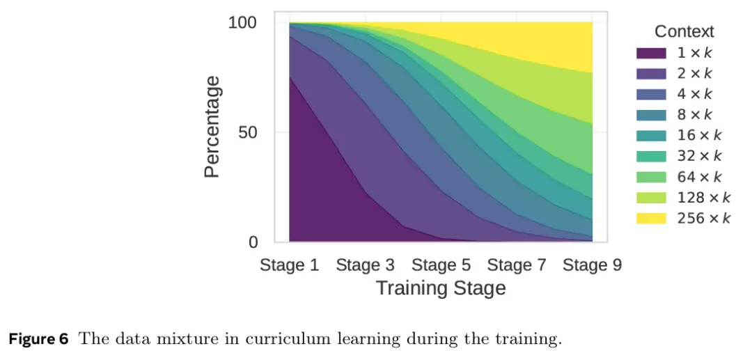 ,以此类推。为了持续调整任务难度,研究者随时间改变数据混合比例,从以较简单任务(例如,单个块嵌入)为主的样本开始,逐步过渡到以更困难任务(即 L 个块嵌入)为主的样本。图 6 提供了课程学习期间数据混合的可视化展示。