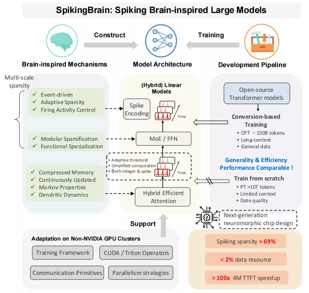 本次发布的国产自主可控类脑脉冲大模型探索了脉冲神经元内生复杂神经动力学与线性注意力模型之间的机制联系,设计了线性模型架构和基于转换的异构模型架构,通过动态阈值脉冲化解决了脉冲驱动限制下的大规模类脑模型性能退化问题,实现了国产GPU算力集群对类脑脉冲大模型训练和推理的全流程支持。