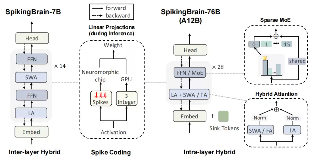 SpikingBrain-7B 和SpikingBrain-76B分别为层间混合纯线性模型和层内混合的混合线性 MoE 模型(图2)。