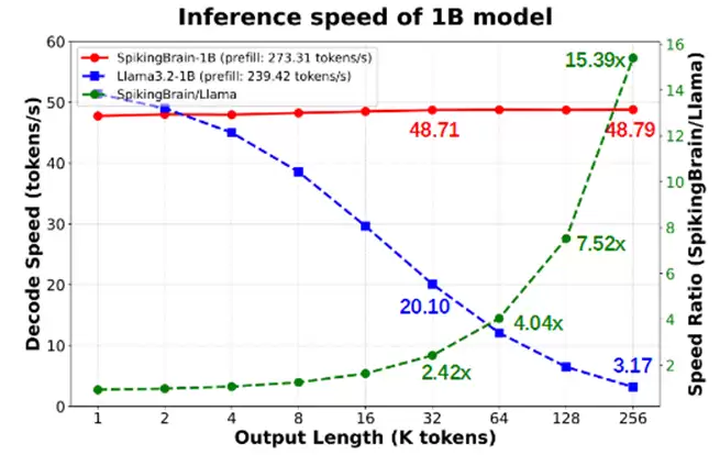 团队将压缩到1B的SpikingBrain-1.0部署到CPU手机端推理框架上,在64k-128k-256k长度下较Llama3.2的1B模型Decoding速度分别提升4.04x-7.52x-15.39x。