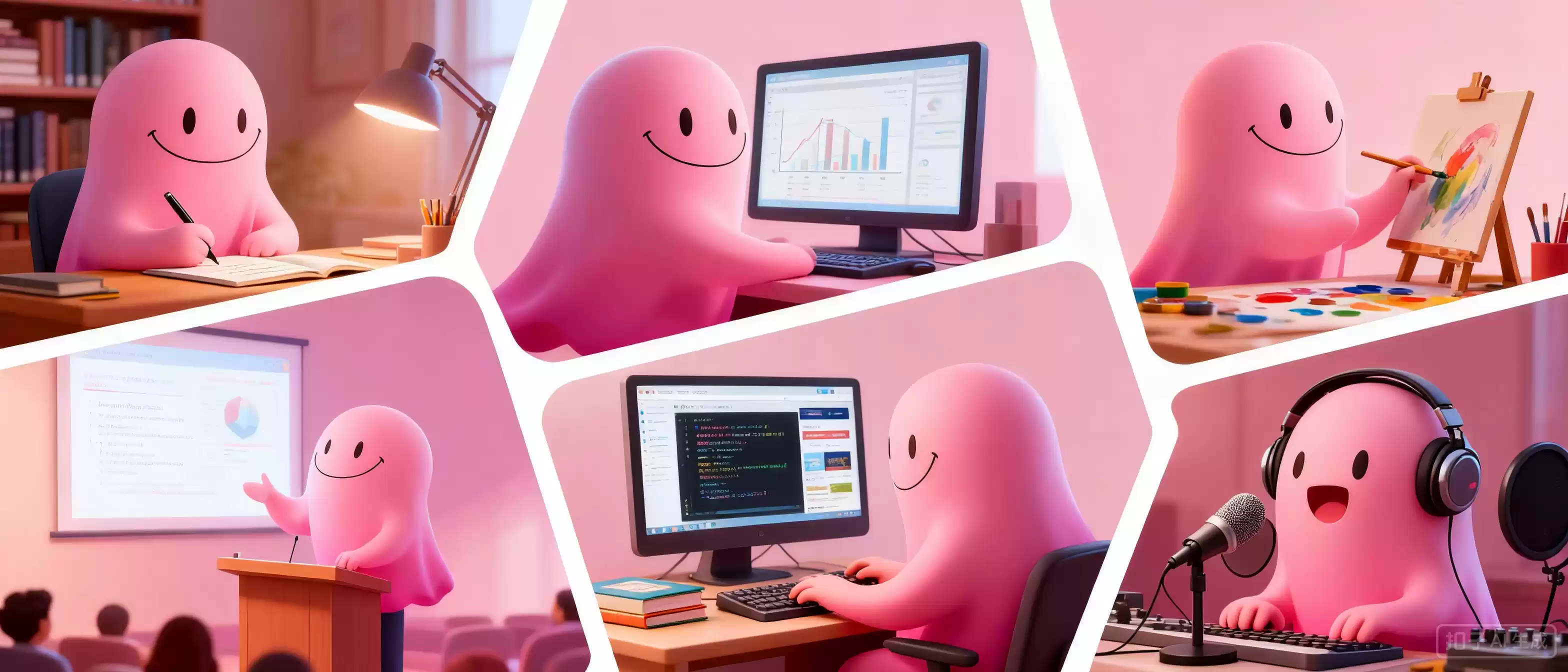 提示词:画面参考漫画分镜风格生成一张图,一共分6个不规则区域,分别IP形象在写作、2分析数据、3画画、4演讲PPT、5敲代码做网页、6录制播客的场景,背景对应区域对应不同场景和不同的动作。参考形象图见附件,21:9比例,图中不带任何文字。