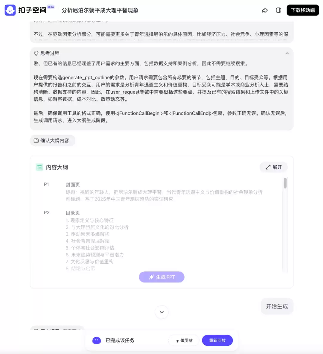 值得注意的一点是,在生成PPT的过程中,扣子空间所展现的思考过程,也非常详细。