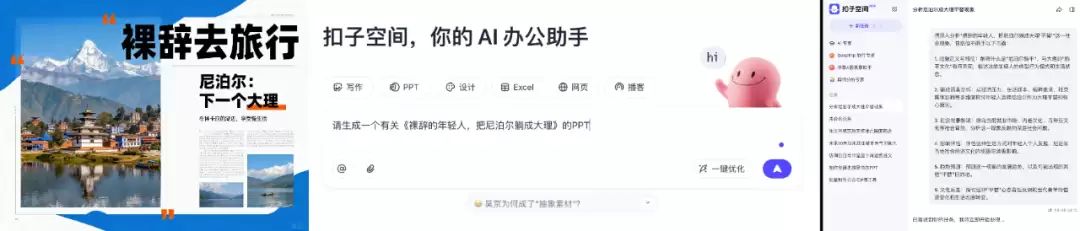我们模拟了一个场景,要求扣子空间根据我们最近的一篇文章《裸辞的年轻人,把尼泊尔躺成大理》,生成一份PPT。