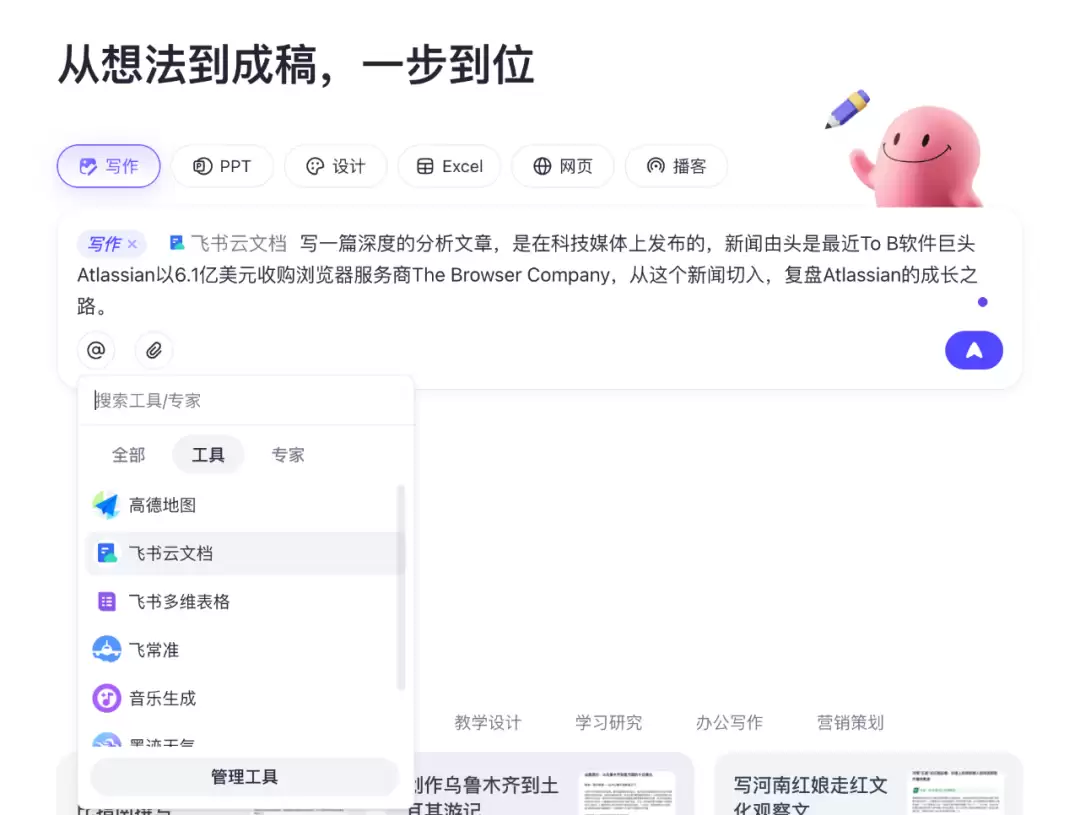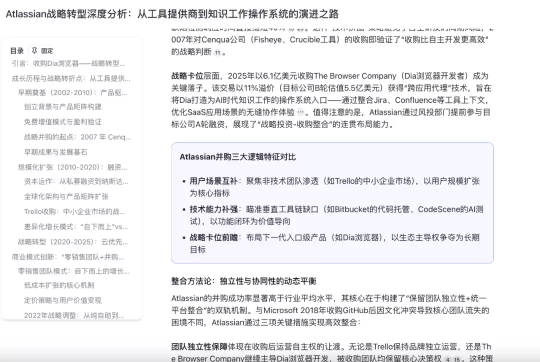 以前两天的一则重要新闻为例——To B软件巨头Atlassian以6.1亿美元收购浏览器服务商The Browser Company,让扣子空间写作一篇深度文章,复盘Atlassian的成长之路。