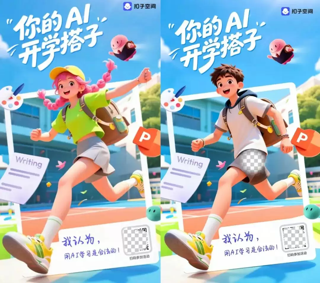 文字一致性也是AI生图场景的一大难点,但扣子空间同样速度很快地完成了图生图任务。无论是人物的神态表情、动作,画面中的元素、文字,甚至二维码,都能很好保持。