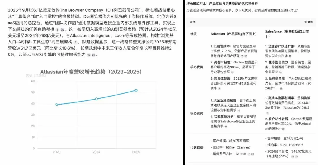 甚至,扣子空间还会预判你的预判。在复盘完Atlassian自身的发展状况之后,还会适当地补充关键数据的走势图,以及增加与同类型产品的对比。