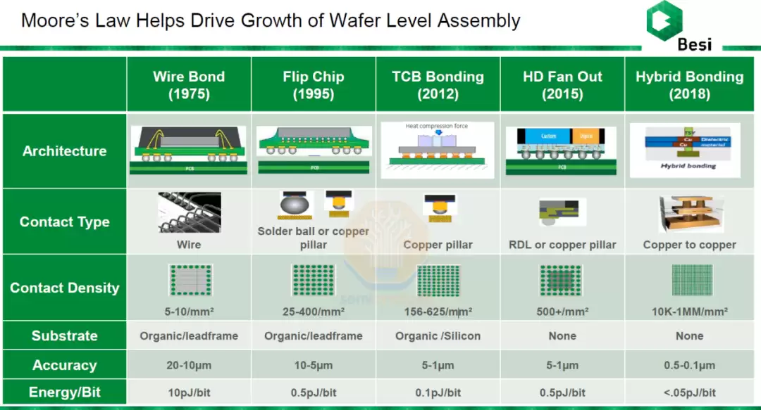 一般来说,封装模式的发展,伴随着键合方式的改变,键合发展的主线是实现更高密度的互联和更小的封装尺寸。