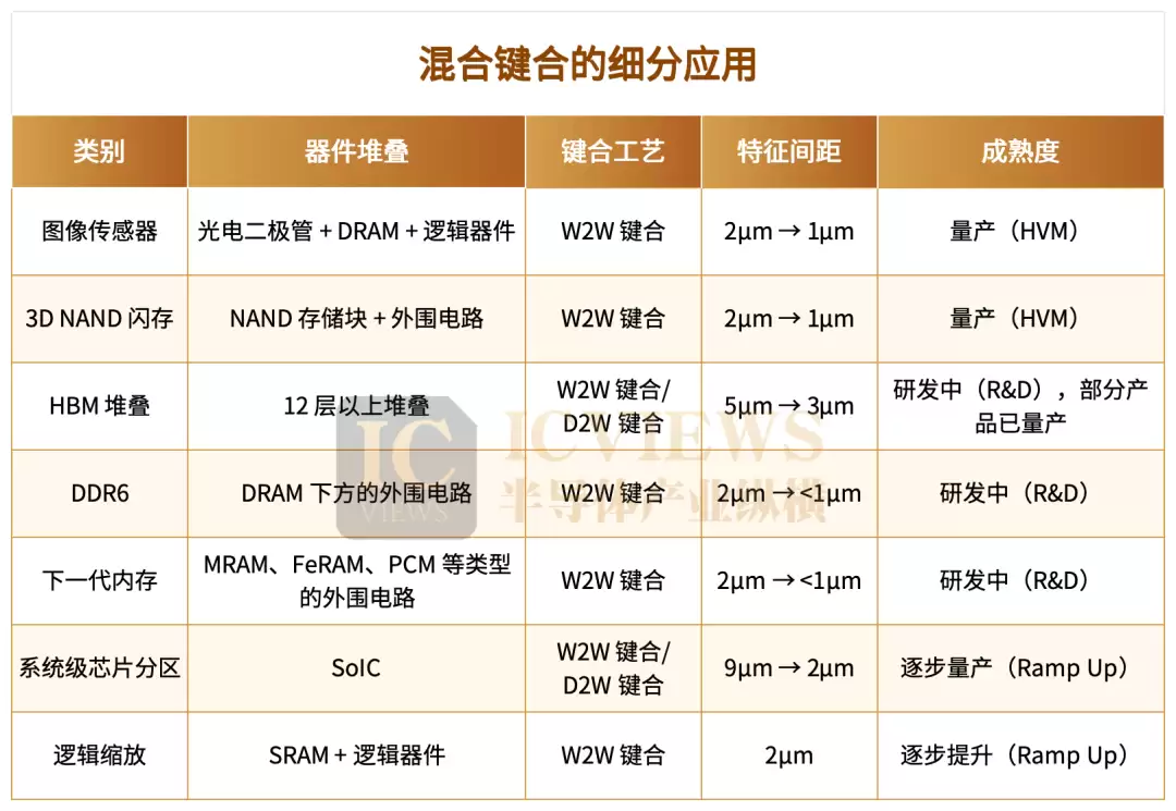 第一个吃螃蟹的是索尼。在2015年,索尼在CMOS图像传感器中应用了Cu-Cu直接键合,成为了第一个混合键合量产的产品。后来的一段时间里,混合键合一直用在CMOS图像传感器上。随着混合键合技术的成熟,逐渐走向了逻辑、3D NAND、HBM等场景。