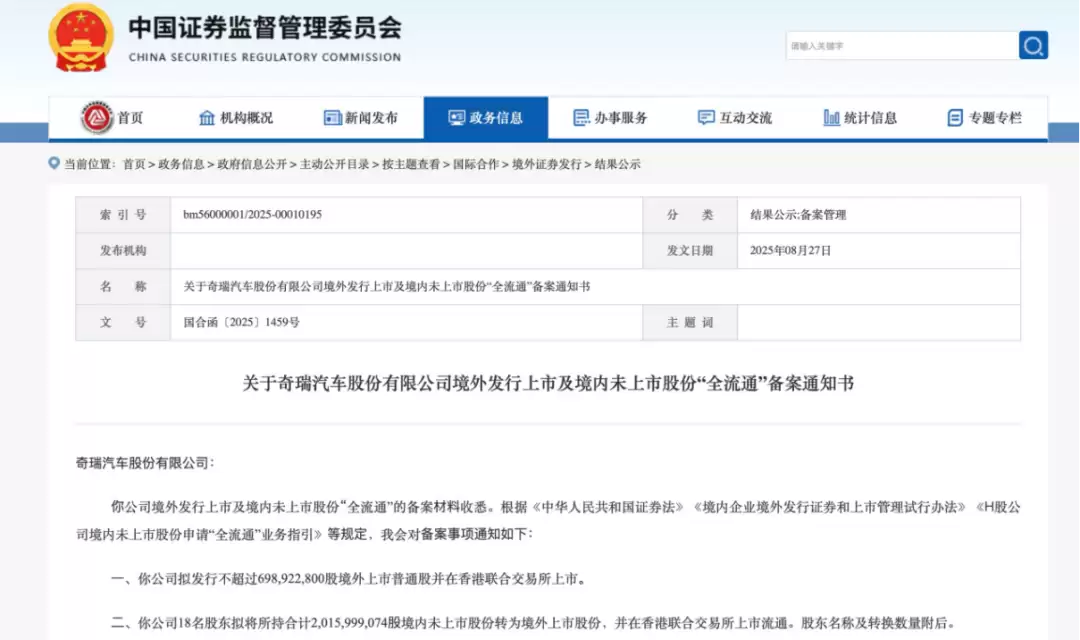 2025年2月28日,奇瑞正式向港交所递交招股书。8月27日,中国证监会国际合作司发布备案通知书,明确奇瑞拟发行不超过6.99亿股境外上市普通股,并允许18名股东将合计20.16亿股境内股份转为境外流通,这一备案为其赴港上市扫清了境内监管层面的关键障碍。