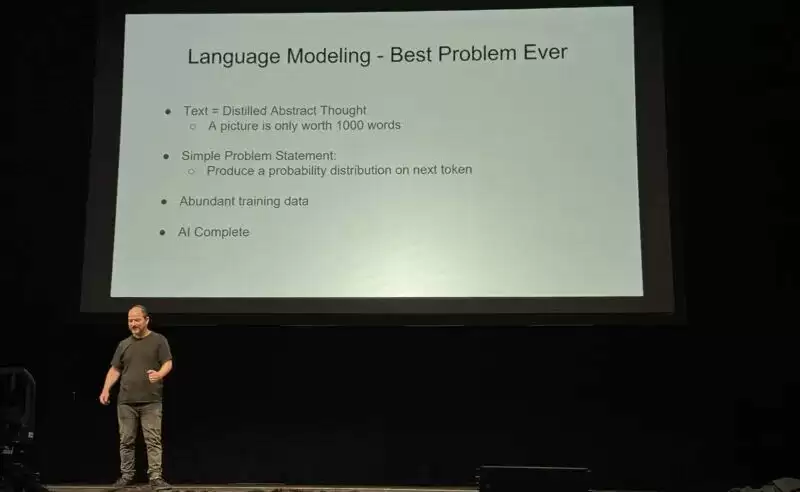 在演讲中,Noam Shazeer强调了几个关键点。首先,Noam 认为语言建模是有史以来最好的问题。正因如此,演讲中有一张幻灯片和一部分内容专门讨论了这个概念。一个多星期过去了,看到他对这个话题如此热情,真是令人欣慰。