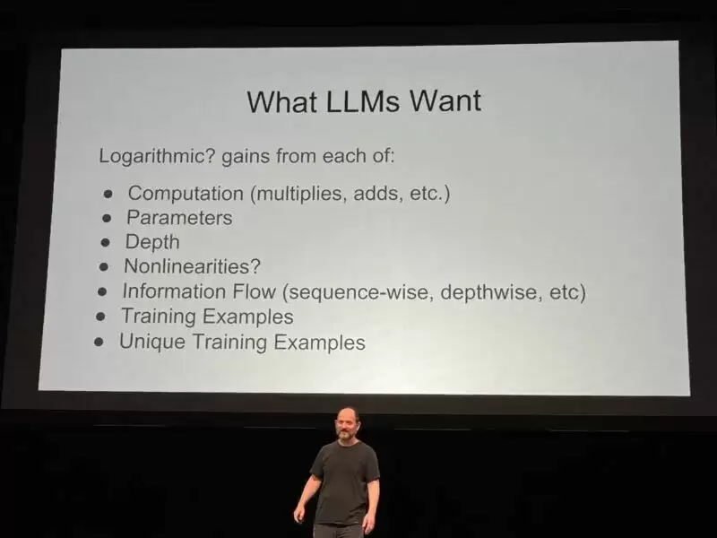 然后他谈到了“LLM 想要什么”。这几乎让我想起了我们常说的“核心越多越好”。他更关注的是 FLOPS 越高越好。这一点很重要,因为随着我们获得更多参数、更多深度、非线性和信息流,LLM 的规模会随之扩大,但计算量也会随之增加。更多优质的训练数据也有助于创建更好的 LLM。