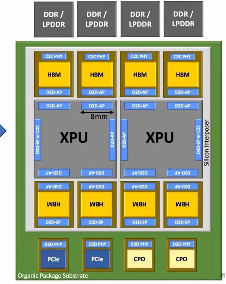 如今,DRAM 连接到 GPU 所连接的 CPU(通常每个 CPU 连接两个 GPU)。CPU DRAM 和 GPU 之间通过 PCIe 的数据传输速率相对较慢。Eliyan 建议将定制 HBM 的背面连接到 LPDDR(比 DDR 功耗更低),以便为加 速 器中的 DRAM 提供更高的带宽。