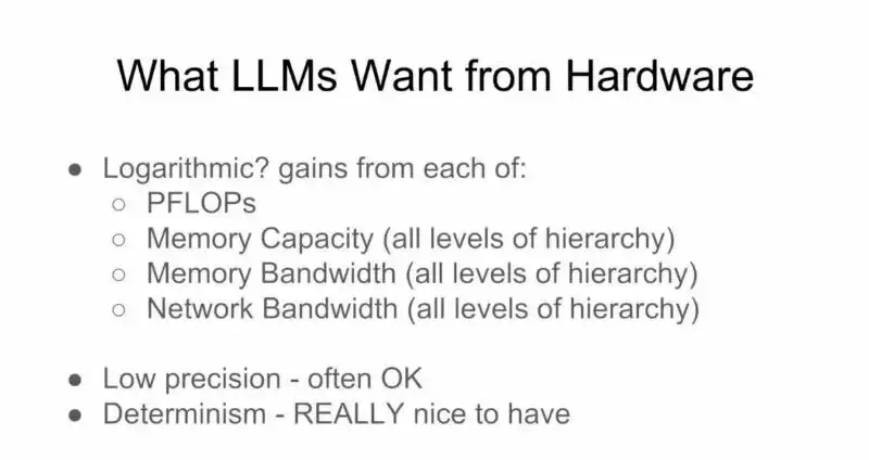这张幻灯片的有趣之处在于,更高的计算能力、内存容量、内存带宽以及更高的网络带宽,对于驱动未来几代人工智能模型都至关重要。或许我是少数接受这种观点的人。在“所有层级”中,不仅包括 DDR5 容量和带宽,还包括 HBM 和片上 SRAM。降低精度有助于更好地利用这四种资源,这在很多情况下也被视为好事。确定性有助于改进编程。