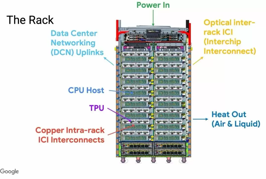 Google TPU 从一开始就采用超立方体互连。每个 TPU 都有 6 个高速互连。在最简单的超立方体中,TPU 以 2 x 2 x 2 的立方体形式连接。每个 TPU 都连接到 X、Y 和 Z 维度上的相邻 TPU。在 2 x 2 x 2 立方体中,所有 TPU 都直接连接到其他所有 TPU。在更大的超立方体中,TPU 之间存在多跳。TPU 配置可动态调整,以适应最多 8,192 个 TPU 的模型规模。现在,如上所示,机架间连接采用可插拔光纤,并添加了一个光开关,用于连接到所有 TPU 共享的超大内存池。