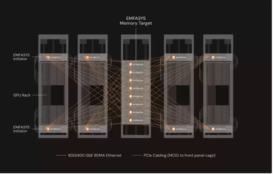 Enfabrica 最近宣布推出用于 LLM 推理的内存结构系统。该系统以 400/800 Gb/秒的数据传输速率连接到 CPU CXL 接口,每个节点可提供高达 18 TB 的 DDR5 DRAM。