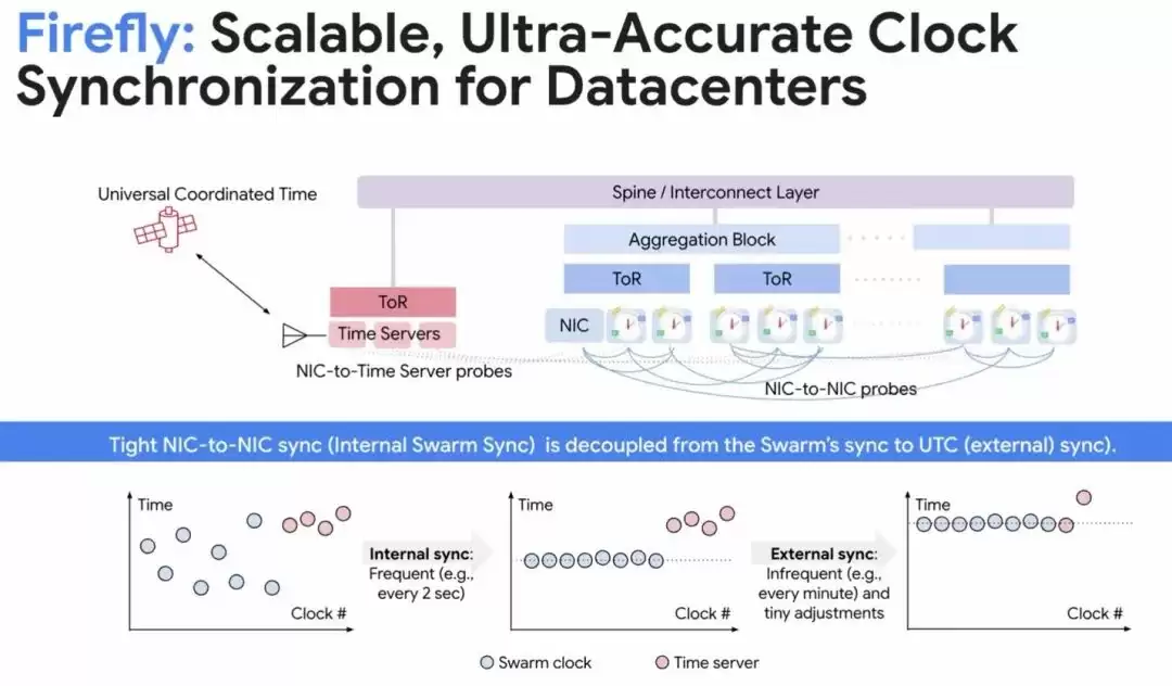 Google 在 Hot Interconnects 大会上展示了训练和网络解决方案的挑战。训练需要数千个加 速 器协同工作。训练过程在各个加 速 器之间进行,但所有加 速 器需要定期共享结果以同步权重。最后一个响应的加 速 器会保持所有其他加 速 器的加速。这被称为 100百分位的尾部延迟。理想的训练网络是可调度且可预测的。Firefly 充当通用节拍器(metronome),提供跨整个数据中心同步的 10 纳秒以下的时钟!