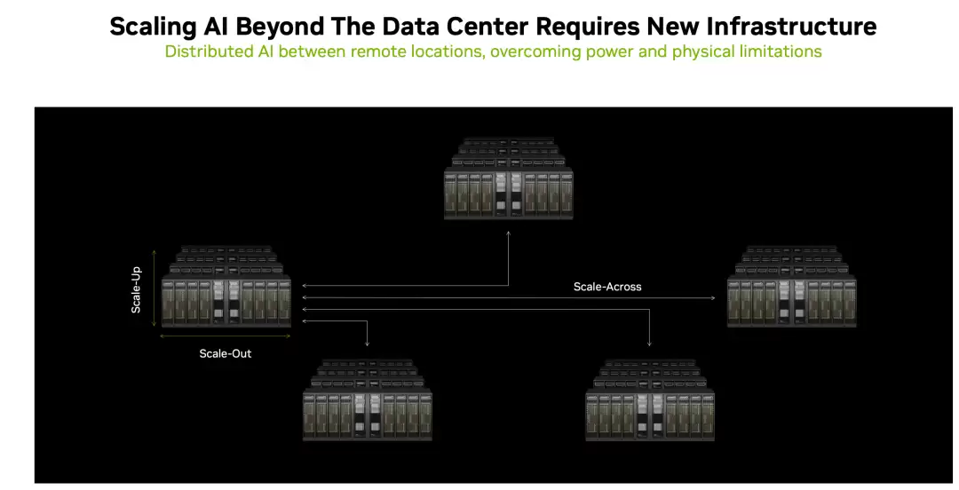“跨规模网络”(Scale-across networking )是一个新术语,我第一次听到它是在 Nvidia 的 Hot Chips 演讲“Co-Packaged Silicon Photonics Switches for Gigawatt AI Factories.”中。这是共封装光学器件 (CPO) 的首次部署。正如他们所解释的,CPO 的目的是与可插拔光学器件相比大幅降低功耗。功耗是数据中心的一个关键限制因素。节省的每一瓦功耗都意味着可以在给定的数据中心功耗预算内安装更多的 GPU。光学器件的另一个优势是,相距数公里的数据中心内的交换机可以互操作。这通常是训练日益庞大的 Frontier LLM 所必需的。