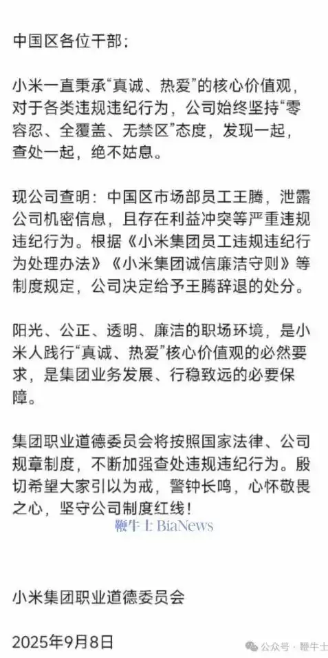 邮件显示:中国区市场部员工王腾,泄露公司机密信息,且存在利益冲突等严重违规违纪行为。根据《小米集团员工违规违纪行为处理办法》《小米集团诚信廉洁守则》等制度规定,公司决定给予王腾辞退的处分。