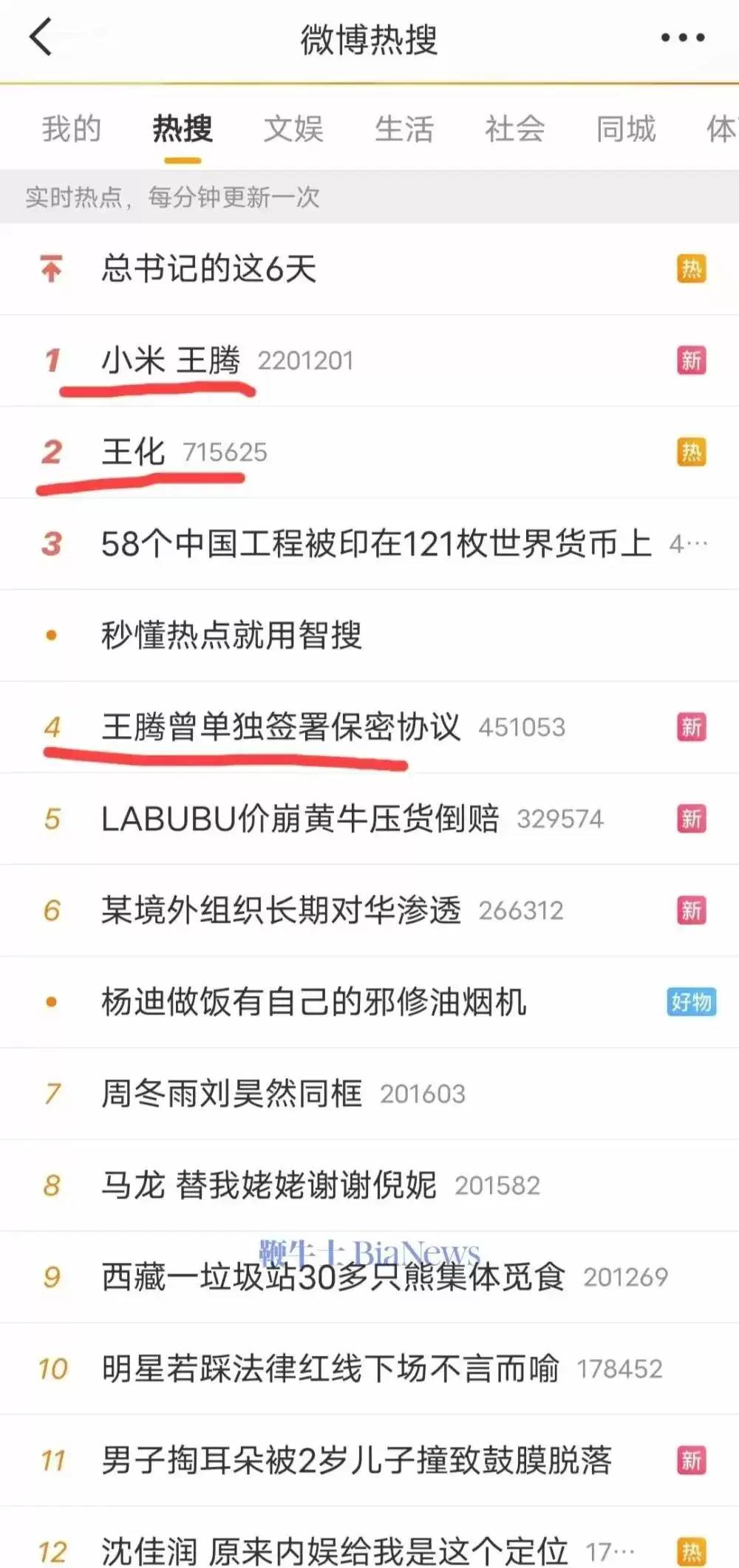 十一二点了,多个话题词轮番登上热搜榜一,一会是雷军,一会是王化称王腾曾单独签署保密协议。