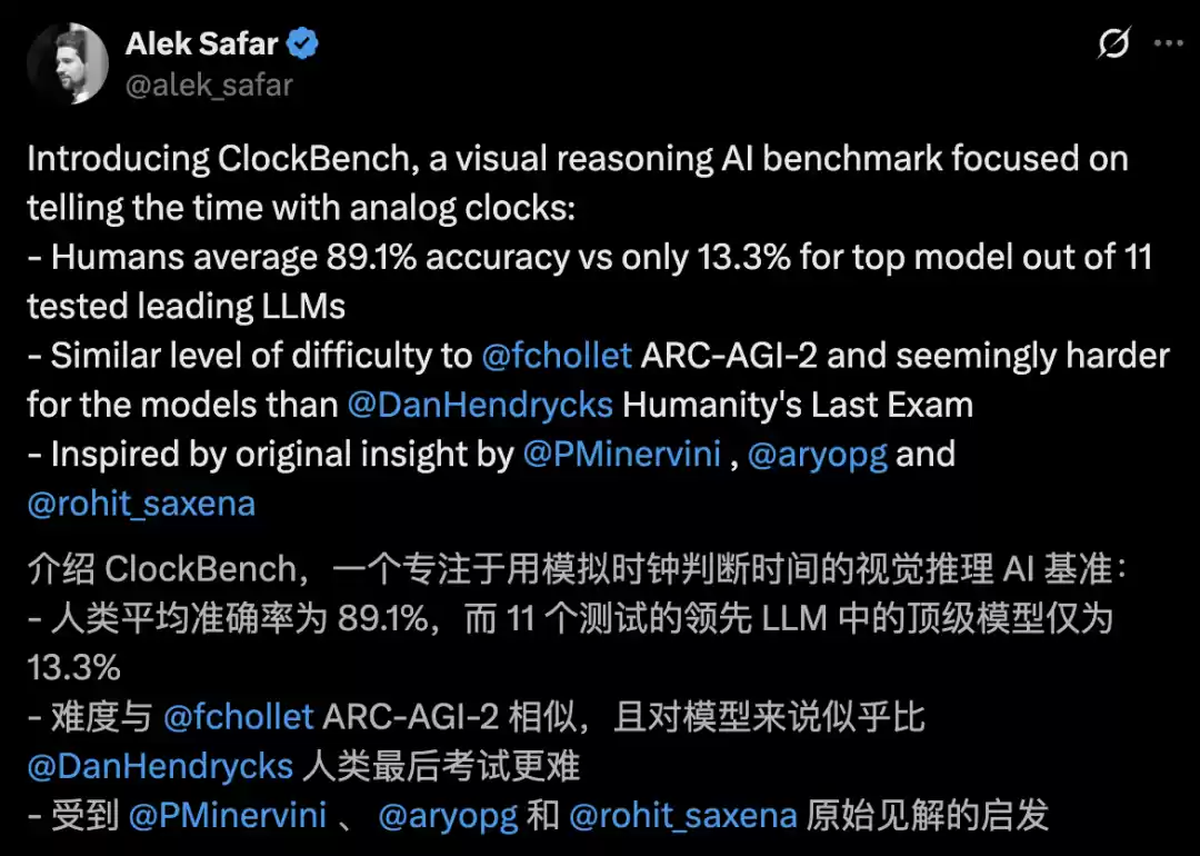 AI基准创建者、连续创业者Alek Safar推出了视觉基准测试ClockBench,专注于测试AI的「看懂」模拟时钟的能力。