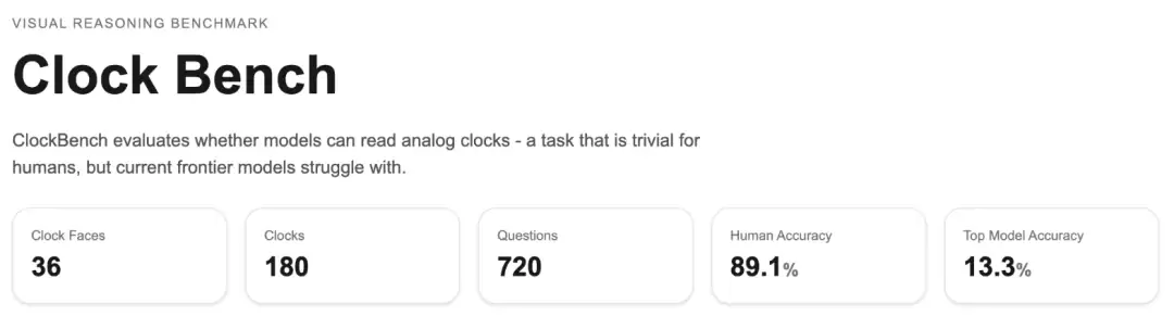一般人准确率89.1%,AI最好只有13.3%。在新视觉基准ClockBench上,读模拟时钟这道「小学题」,把11个大模型难住了。为什么AI还是读不准表?是测试有问题还是AI真不行?
