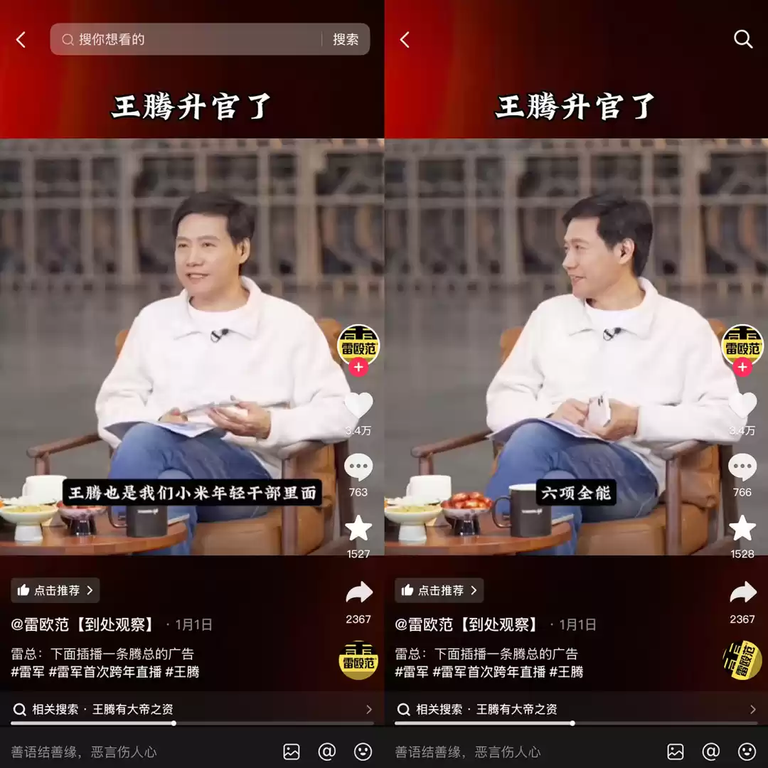 社交媒体上,王腾在微博拥有178万粉丝,他还得到了能与雷军没有距离感、相互调侃的“特别待遇”,甚至常被雷军称为“腾总”,今年的跨年直播中,雷军更评价王腾是“年轻干部、六项全能、轮岗经验丰富”。