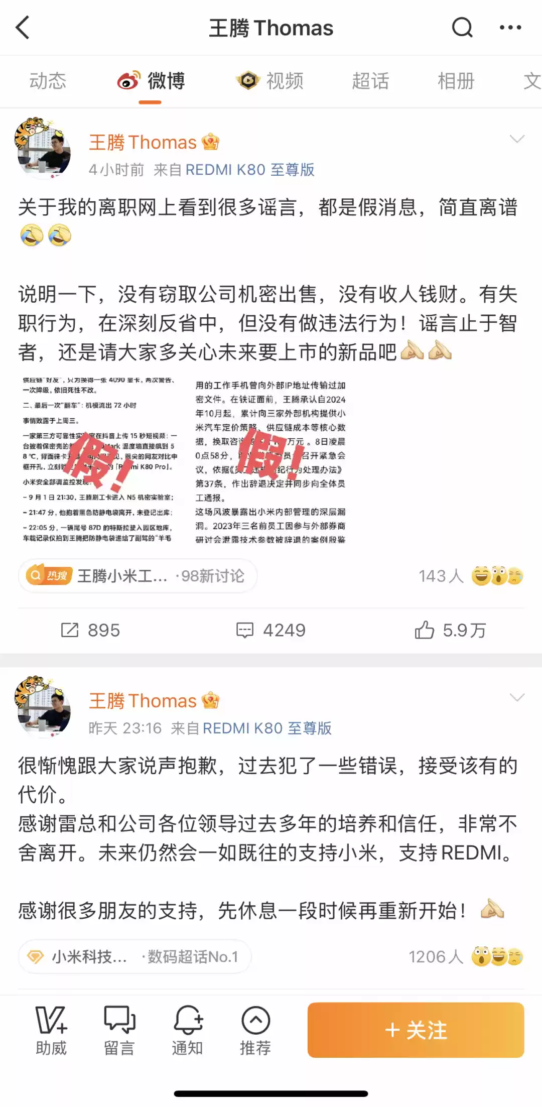 2024年4月,有网友爆料王腾因泄露RedmiK50标准版新品发布时间,被内部判定为“二级泄密”,遭受了取消年度晋升、扣除5000元绩效奖金的处分。