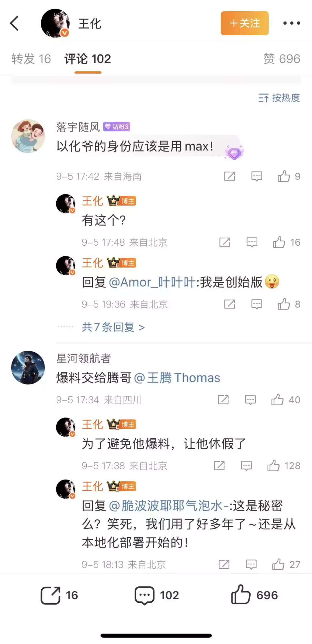 耐人寻味的是,9月5日,王化在自己的微博中,当网友提及王腾时,他回复:“为了避免王腾爆料,让他休假了”。