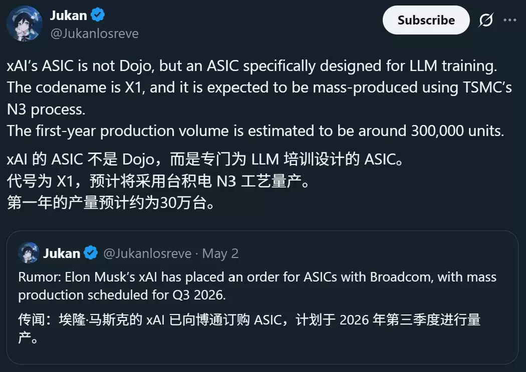 一则关于xAI正采用台积电3nm工艺自研“X1”推理芯片、目标2026年Q3量产的消息,再次引爆了全球科技圈。