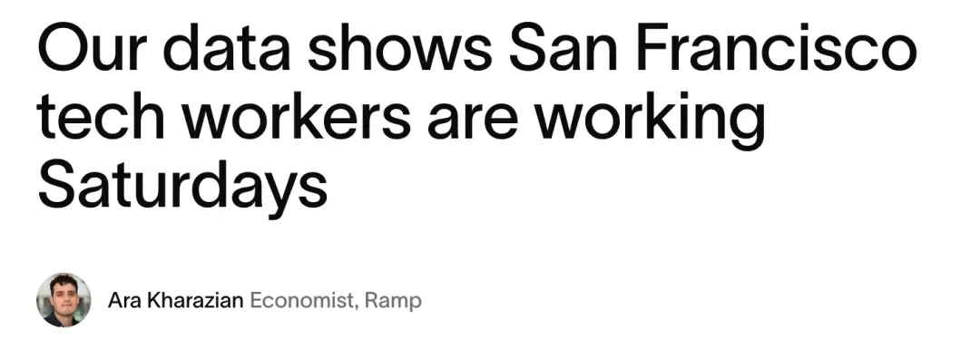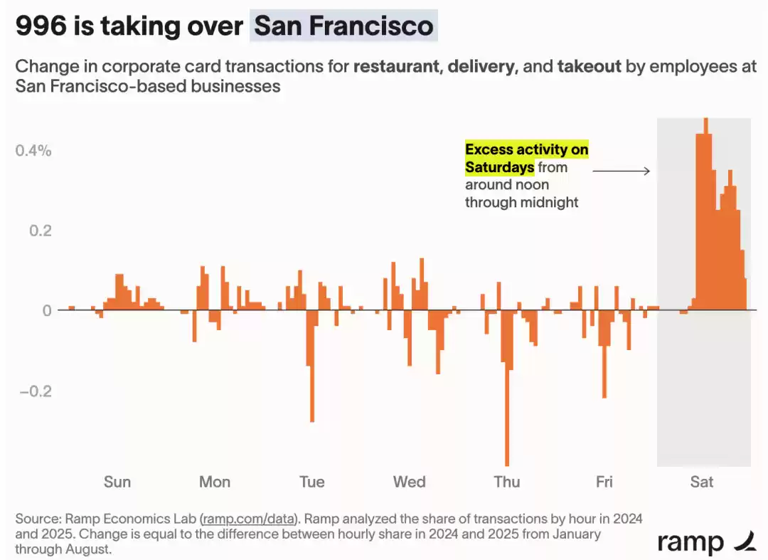这位小哥基于 Ramp 的交易数据,发现旧金山的 996 现象确实存在。旧金山的员工在周六工作时间的增加,已经在消费趋势上有所体现。