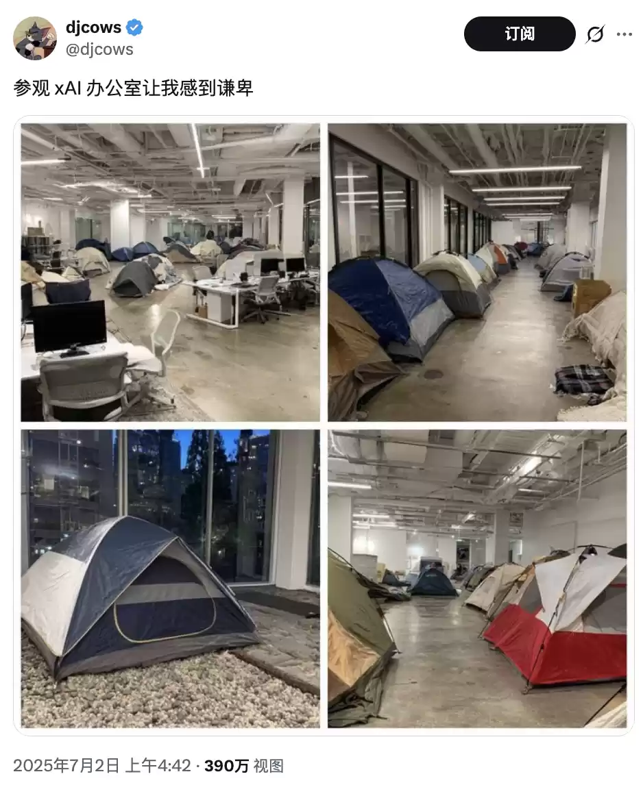 比如马斯克就是加班的头号积极分子。前段时间,马斯克带头在公司搭起了帐篷,以便通宵达旦地开发 Grok 4。