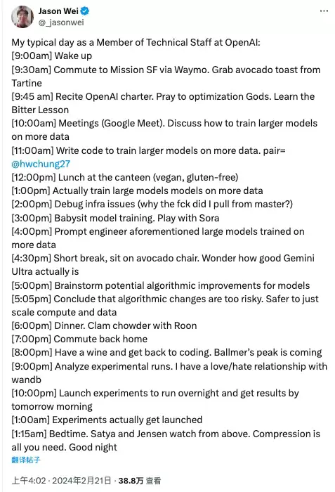 「思维链」作者 Jason Wei 去年也在 X 上贴出了自己在 OpenAI 的一张作息时间表,9 点起床,凌晨 1 点 15 分睡觉,比 996 还疯狂。
