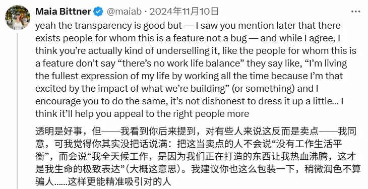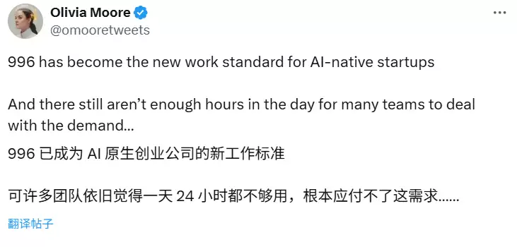 在 AI 飞速发展的今天,AI 从业者面临「不得不卷」,a16z 合伙人 Olivia Moore 曾发推指出,超长工时在 AI 初创公司中已是普遍现象,需求多到一天 24 小时连轴转都感觉时间不够用。