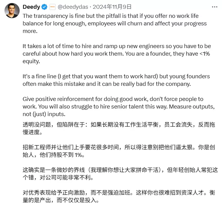 对此,硅谷 VC 大佬 Deedy 认为,创始人应通过激励员工达成高效产出,而非强迫他们长时间投入,因为过度压榨会导致人才流失,最终反而损害公司的发展进度。