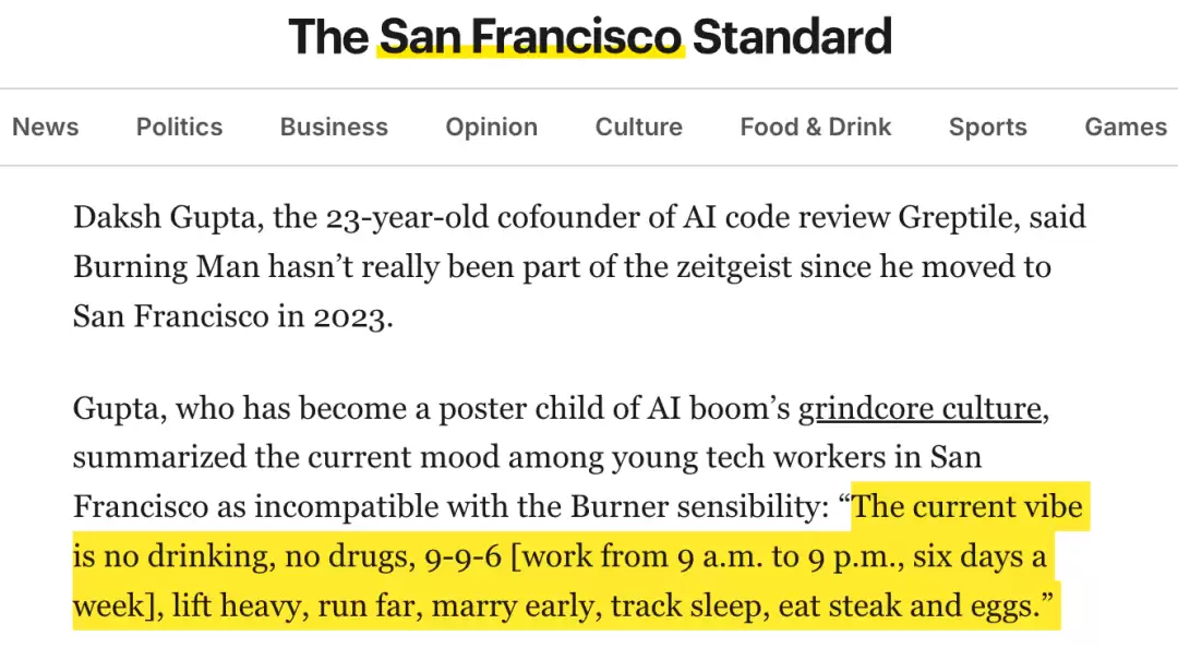 人工智能初创公司 Greptile CEO Daksh Gupta 也曾在一篇报道中总结旧金山年轻科技工作者的状态:不喝酒、996、举重、跑步、早婚、追踪睡眠、吃牛排和鸡蛋。