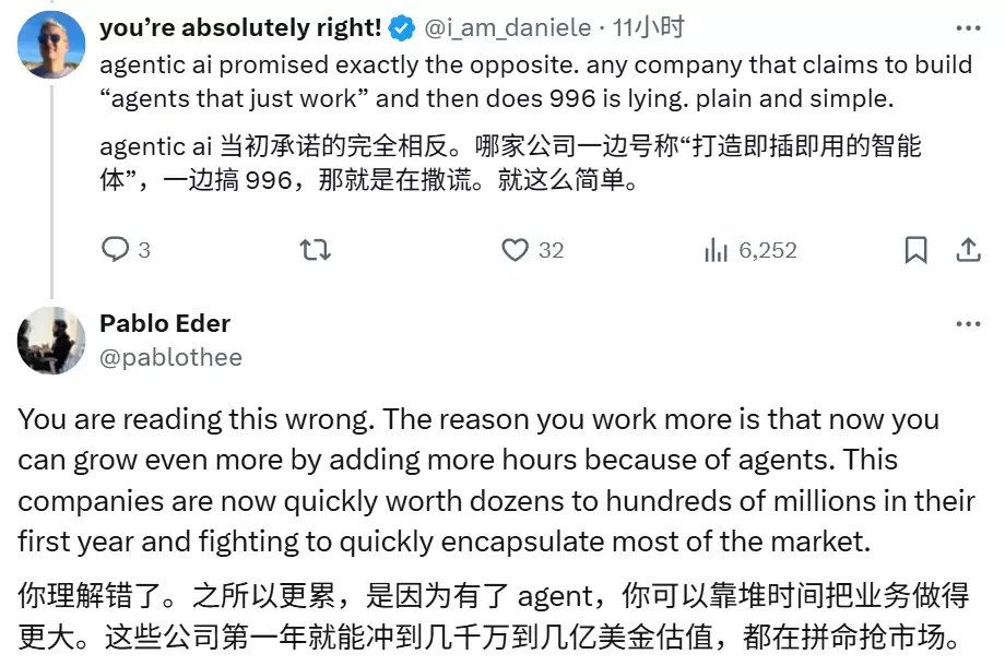 对于「上班 996,下班 ICU」的现象,还有网友锐评,这群 AI 公司动不动就号称打造即插即用的智能体,将打工人从繁忙的工作中解放出来,自己却在搞 996。