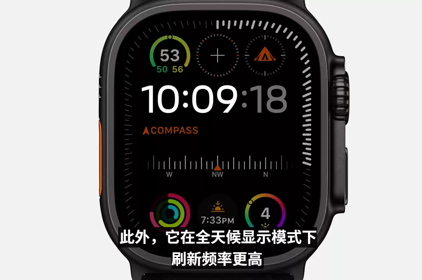屏幕黑边更窄,在不调整机身尺寸的前提下,Apple Watch Ultra 3做到了更大的屏幕尺寸。而且在全天候显示模式下,它可以做到更高的屏幕刷新率,即便是在不点开屏幕的情况下,依旧可以观察到表盘的动画细节。