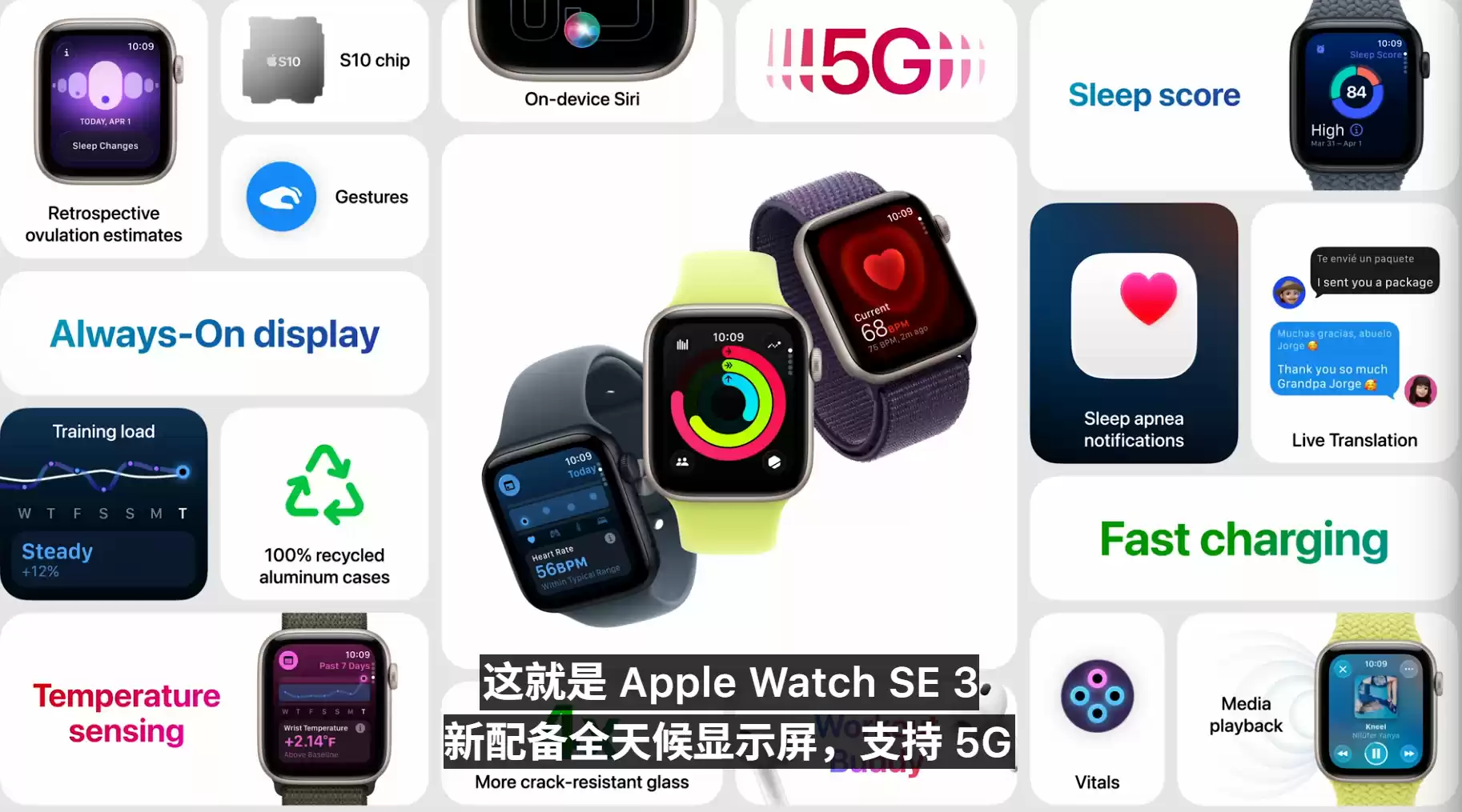 最后,这三款新Apple Watch均支持5G蜂窝数据连接、睡眠评分和手腕温度检测等功能,苹果至少是把Apple Watch的几项核心卖点都对齐了。