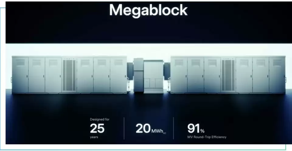 在特斯拉的发布会上,该公司还推出了为工商业、大型能源项目等场景设计的 “储能超级模块”Megablock。该产品通过一体化整合设计,将四台“Megapack 3”设备、可承载超大电压的专用变压器,以及配套开关设备集成于同一系统中,最终形成一套完整的 “即插即用” 储能解决方案。Megablock无需额外进行复杂的组装工序,用户只需完成基础接线,即可直接投入使用,大幅简化了部署流程。