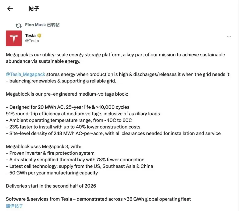 特斯拉最新X账户发文宣布推出Megapack 3和Megablock