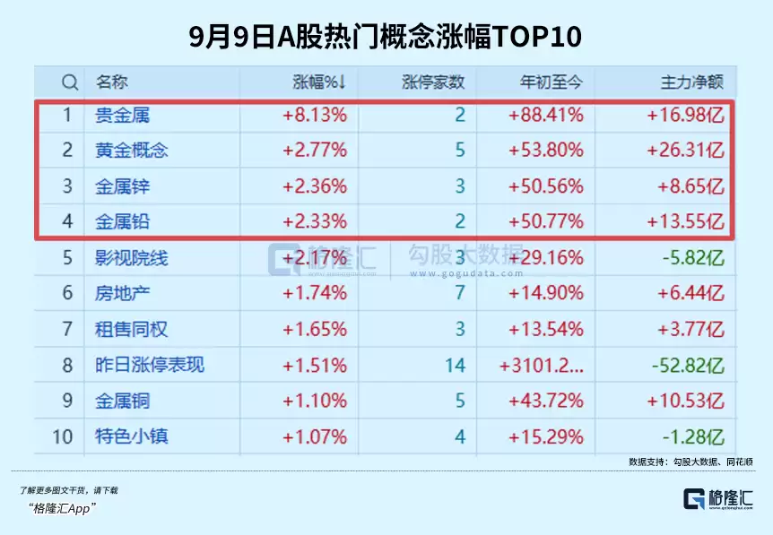 然而,尽管大市环境走弱,黄金、有色金属等板块却集体走出了逆势大涨行情,其中贵金属指数大涨8.3%,锌、铅、铜、铝等工业有色金属板块均明显大涨,盘中涨幅贵金属及有色概念股多达十多只。